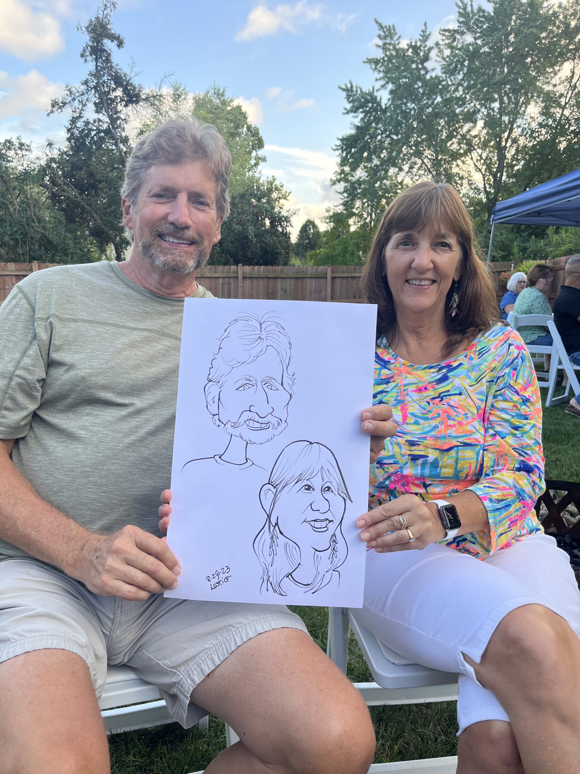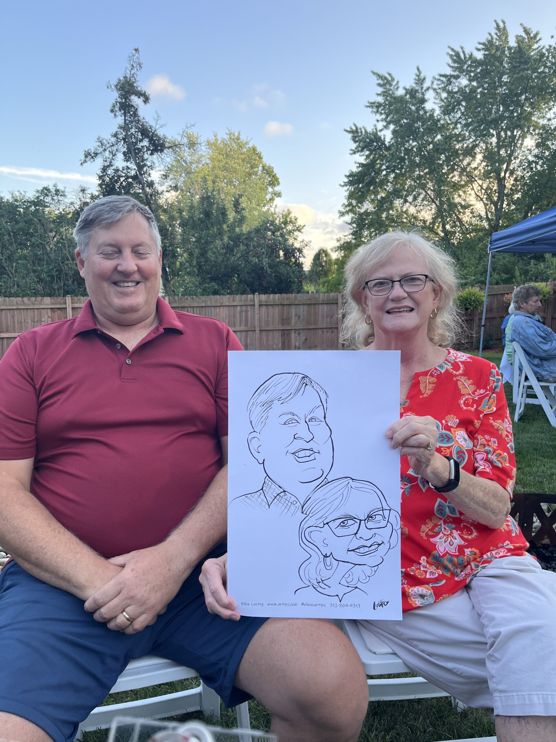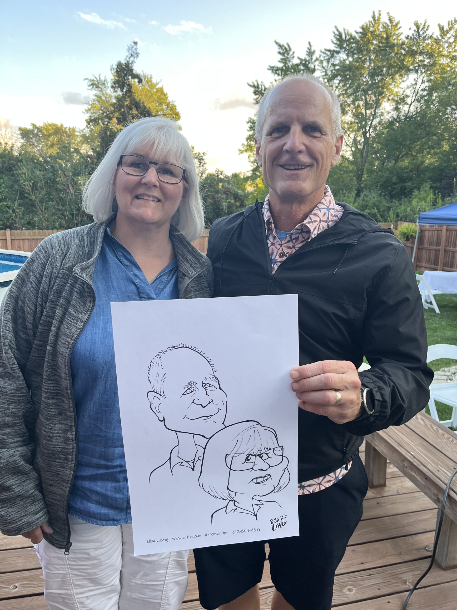 The Nichols hire Ellen to draw Caricatures at their dinner party On 8/26/23, I drew the couples at the Nichol’s home in Vernon Hills, Il. The drawings were transferred to a canvas as a gift to the celebrants. Share this: Click to share on Facebook (Opens in new window) Facebook Click to share on X (Opens in new window) X